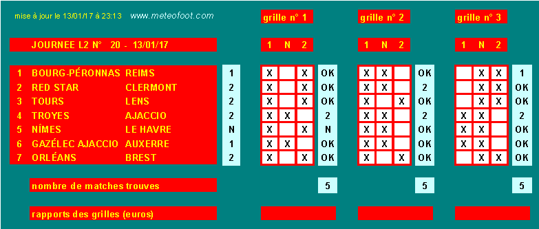 - Bourg - Reims : les rémois sont naturellement favoris. Ca leur arrive quand même de se planter,particulièrement à l'extérieur (nul chez la lanterne rouge Orléans lors de la dernière journée). Bourg est invaincu depuis 7 journées (dont 5 nuls). Ca mérite de mettre des croix partout.