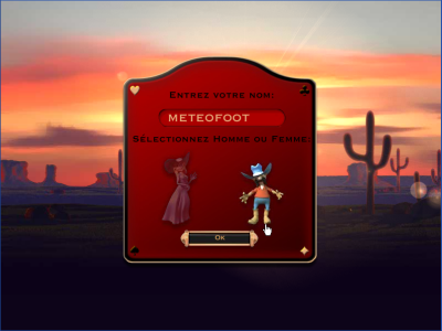 Le jeu commence par une page d'accueil qui vous invite à saisir un nom de joueur, et à déterminer votre genre (féminin ou masculin) en cliquant sur l'une des deux figurines (jusque là en principe vous n'avez pas besoin d'aide).