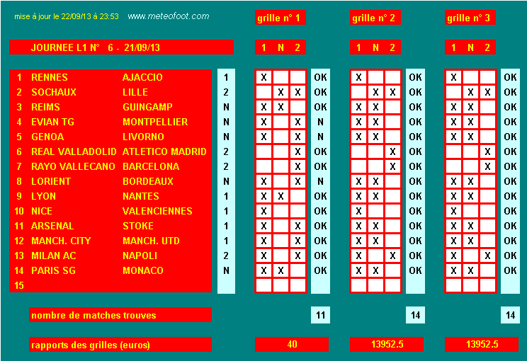 Samedi 8 février 2014 - 18h30 IMPORTANT Le match Bordeaux - Lorient ayant été reporté à une date ultérieure en raison des intempéries (voir information sur le forum publiée à 13h02 ce samedi 8 février), le match n°9 sera considéré gagnant. Les grilles de meteofoot ont donc été corrigées en conséquence (une seule croix sur le match Bordeaux Lorient) _____________________________________________________________________________________________________ Samedi 8 février 2014 Personne au rang 1 la semaine dernière : grille pactolée 1.000.000€ ce WE. Extrêmement attractif, mais la rose a des épines : allez trouver des bases fiables sur ce tirage ! Et on ne parle même pas de la météo qui peut ajouter son grain de sel dans une sélection de rencontres déjà bien pimentée. Nous n'avons extrait que 3 bases : impossible de faire mieux. Lille aurait pu faire la 4ème. Mais entre leurs tristes performances de ces dernières semaines et le regain de vitalité des sochaliens, on redoute un coup de Trafalgar. Bien entendu, la couverture que meteofoot peut se permettre sur ces simulations de pronostics n'est pas à la portée de la première bourse venue : si on est un peu "serré" une base lilloise sur ce match n'est pas honteuse. Ou alors autre solution : filtrer les grilles de meteofoot style "osmose inverse". Cela dit, on n'est pas encore au bout du WE : il va d'abord falloir passer nos trois bases. Et ça ne sera pas un long fleuve tranquille. Les sélectionnés sont cependant dans la plupart des pronostics du web, et ne surprendront donc personne :