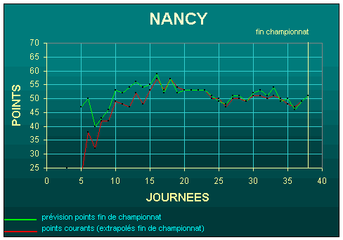 La courbe verte ci-dessous montre que les pronostics situent NANCY entre les 8ème et 10ème places à la même époque. Ce qui se confirmera ultérieurement, NANCY terminant finalement à la 9ème place.